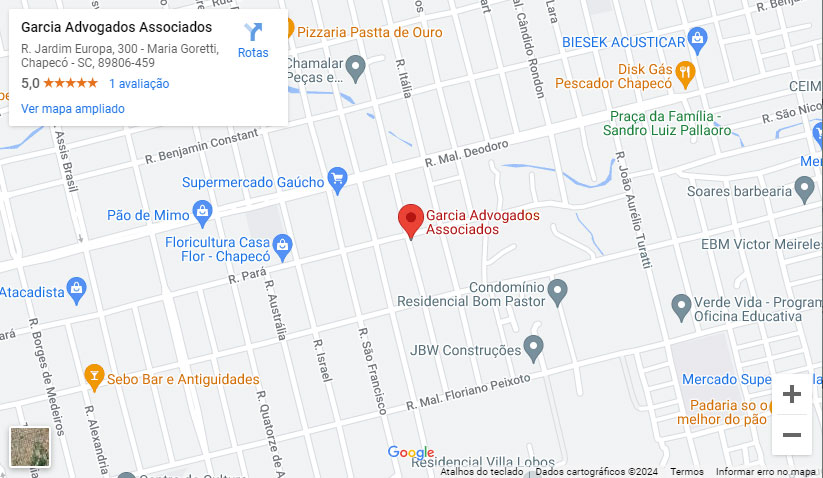 O Escritório Garcia Advogados Associados, fundado pelos advogados Ronaldo Garcia e Daiane Garcia, com sede própria na cidade de Chapecó - SC, tem como meta oferecer serviços jurídicos de altíssimo nível, buscando êxito e rapidez na solução das causas que nos são confiadas. Nosso Escritório de Advocacia está sempre atuando em conjunto com parcerias competentes, com advogados com mais de 7 anos de atuação, trabalhando de forma preventiva e contenciosa, seja em sede administrativa ou judicial, em todas as instâncias e Tribunais. Atuamos com respeito, transparência, seriedade, competência e com moderna infraestrutura de tecnologia jurídica e de informação, oferecendo assim, um serviço de excelência, atendendo as especificidades de cada cliente.